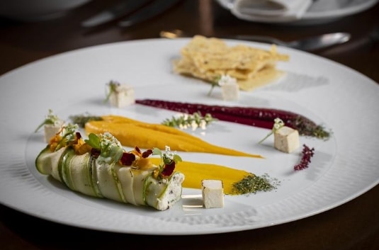 Orgânicos da terra: trio de cenoura, canelone de abobrinha recheado com tofu e cogumelos, crostini de polvilho com casca de mandioca